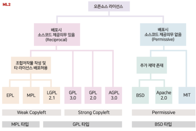 - 추가로, 라이선스의 출현 배경에 따라서 크게 MPL타입, GPL타입 그리고 BSD타입으로 나눌 수도 있습니다.